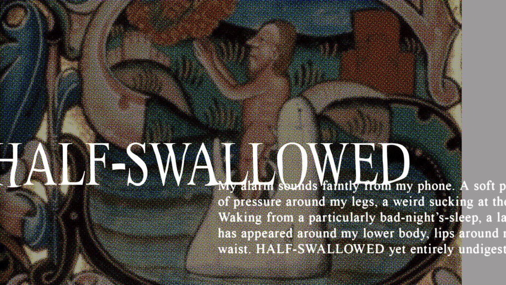 My alarm sounds faintly from my phone. A soft pulsation of pressure around my legs, a weird sucking at the hips. Waking from a particularly bad-night’s-sleep, a large fish has appeared around my lower body, lips around my waist. Half-swallowed yet entirely undigested. I am not dreaming (the fish indicates this, meeting my gaze with its eyes of moist marble). I’m still me, I think to myself. But I’m also it. Or, rather, the fish and I are one, a hybrid thing. My bedsheets are salty and wet.