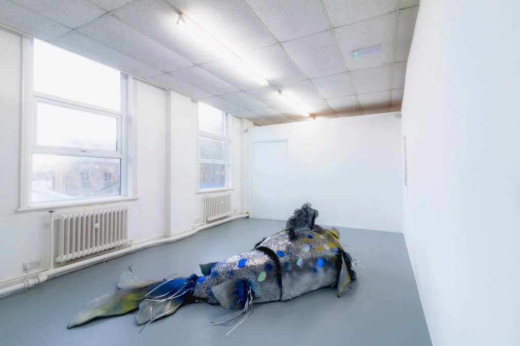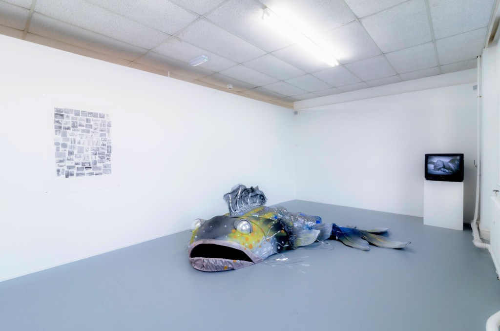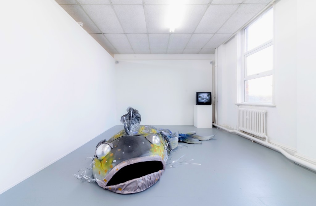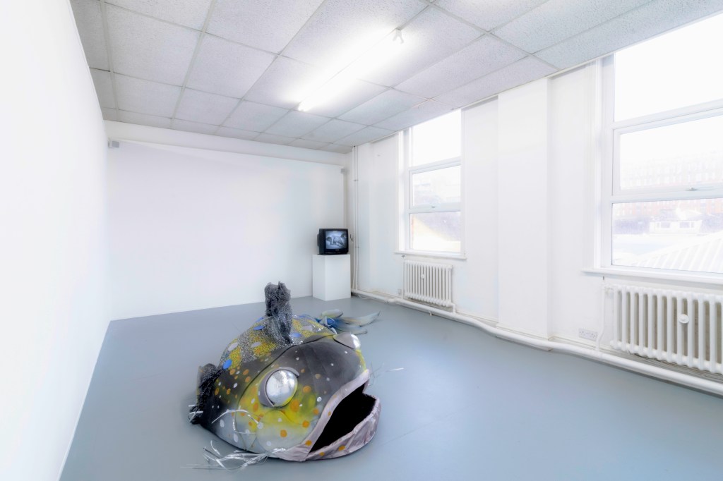 Through a collection of spoken and written text, imagery and costume, HALF-SWALLOWED presents fragments from a scenario in which a person finds themself part-way consumed by a large Fish. Childhood memories of playing on the seashore; watery mythological creatures; hoax Mermaids and the surprisingly wet feeling of an interspecies connection are unpacked in a slippery series of fragmented thoughts. The exhibition is the latest manifestation of ongoing research and writing into multispecies entanglements, climate precarity and more-than-human survival that permeates Williams’s practice. HALF-SWALLOWED is a response to growing up on the border of land and water and spending time in Blackpool, as well as the appearance of the mermaid and other forms of human-fish hybrids that appear in both local and global folk tales.